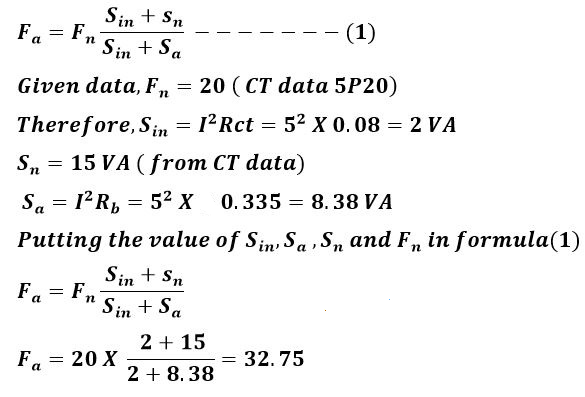 The actual ALF of CT is 68. The ALF of the CT changes with change in the burden. Let us take the same example with different burden. Let CT burden is 0.335 Ω. The actual ALF can be calculated as follows.